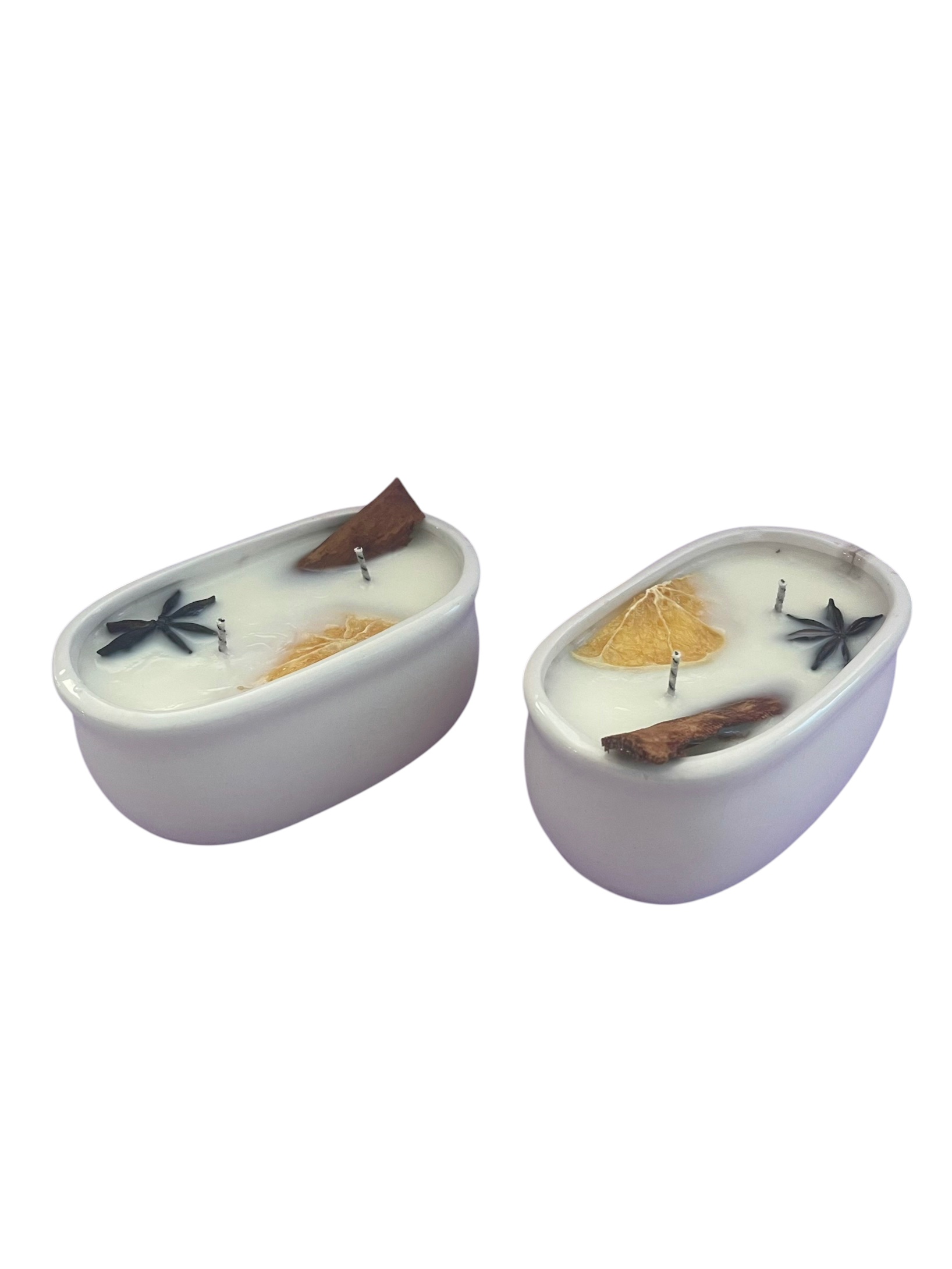 Vela artesanal de cera de soya con fragancia de canela, decorada con elementos naturales como anís, canela y naranja para crear un ambiente cálido y acogedor.